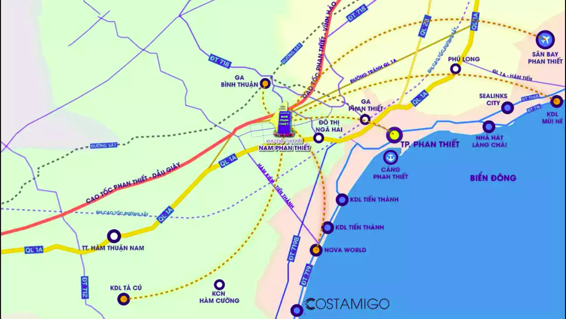 Vị trí dự án Costamigo Phan Thiết còn gây ấn tượng với khách hàng đang bởi sở hữu những ưu thế cực lớn từ hạ tầng giao thông của khu vực. Dự án Costamigo đang có khả năng kết nối dễ dàng đến một loạt các tuyến đường huyết mạch như đường Lạc Long Quân, ĐT719, ĐT712, ĐT707, Quốc lộ 55B, Quốc lộ 1A,… Nhờ vậy mà việc di chuyển của cư dân từ dự án đến các tỉnh thành và khu vực lân cận càng trở nên dễ dàng hơn.