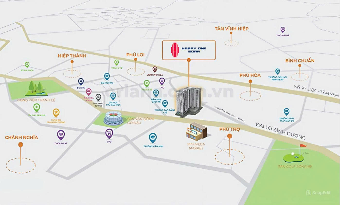 Happy One Oriana nằm tại khu vực trọng điểm, dễ dàng kết nối đến trung tâm TP.HCM và các quận lân cận qua những tuyến đường huyết mạch. Vị trí này không chỉ mang lại tiềm năng tăng giá cao mà còn thuận tiện cho việc di chuyển, kinh doanh hoặc cho thuê.